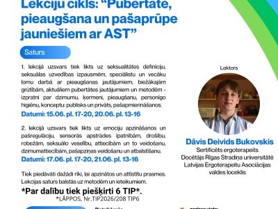Divu lekciju cikls: “Pubertāte, pieaugšana un pašaprūpe jauniešiem ar AST” 1. lekcijas datumi: 15.06. pl. 17-20, 20.06. pl. 13-16 2. lekcijas datumi: 17.06. pl. 17-20, 21.06. pl. 13-16 Zoom platformā. PAR DALĪBU TIEK PIEŠĶIRTI 6 TIP (LĀPPOS, Nr.TIP2026/208) Pasākums saskaņots ar LĀPPOS. Lekciju cikls būs noderīga gan veselības aprūpes speciālistiem – ergoterapeitiem, psihologiem u.c., gan…