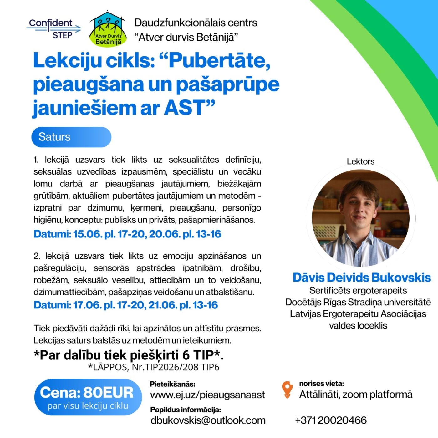 Lekciju cikls būs noderīga gan veselības aprūpes speciālistiem – ergoterapeitiem, psihologiem u.c., gan ABA speciālistiem, pedagogiem, aprūpētājiem, vecākiem un citiem interesentiem, kas nonāk saskarsmē ar pieaugšanas un pubertātes jautājumiem jauniešiem ar AST.