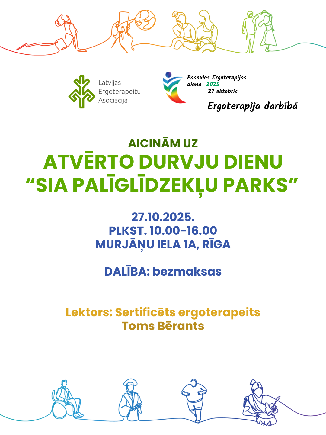 Pasaules ergoterapijas nedēļas “Ergoterapija darbībā” ietvaros aicinām Jūs uz atvērto durvju dienu Speciālo palīglīdzekļu parks, kur būs iespēja gan redzēt dažāda veida tehniskos palīglīdzekļus (TP) klātienē, gan arī saņemt vērtīgu informāciju par TP no sertificēta ergoterapeita Toma Bēranta.