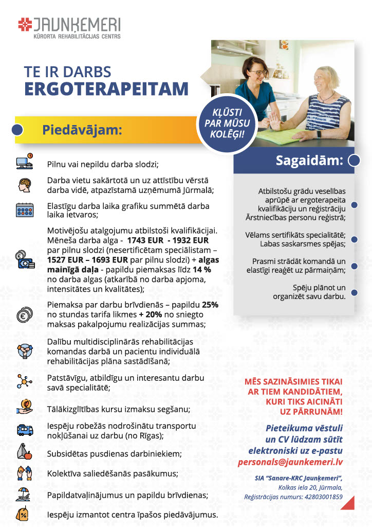 VAKANCE ERGOTERAPEITAM SIA „Sanare – KRC Jaunķemeri”