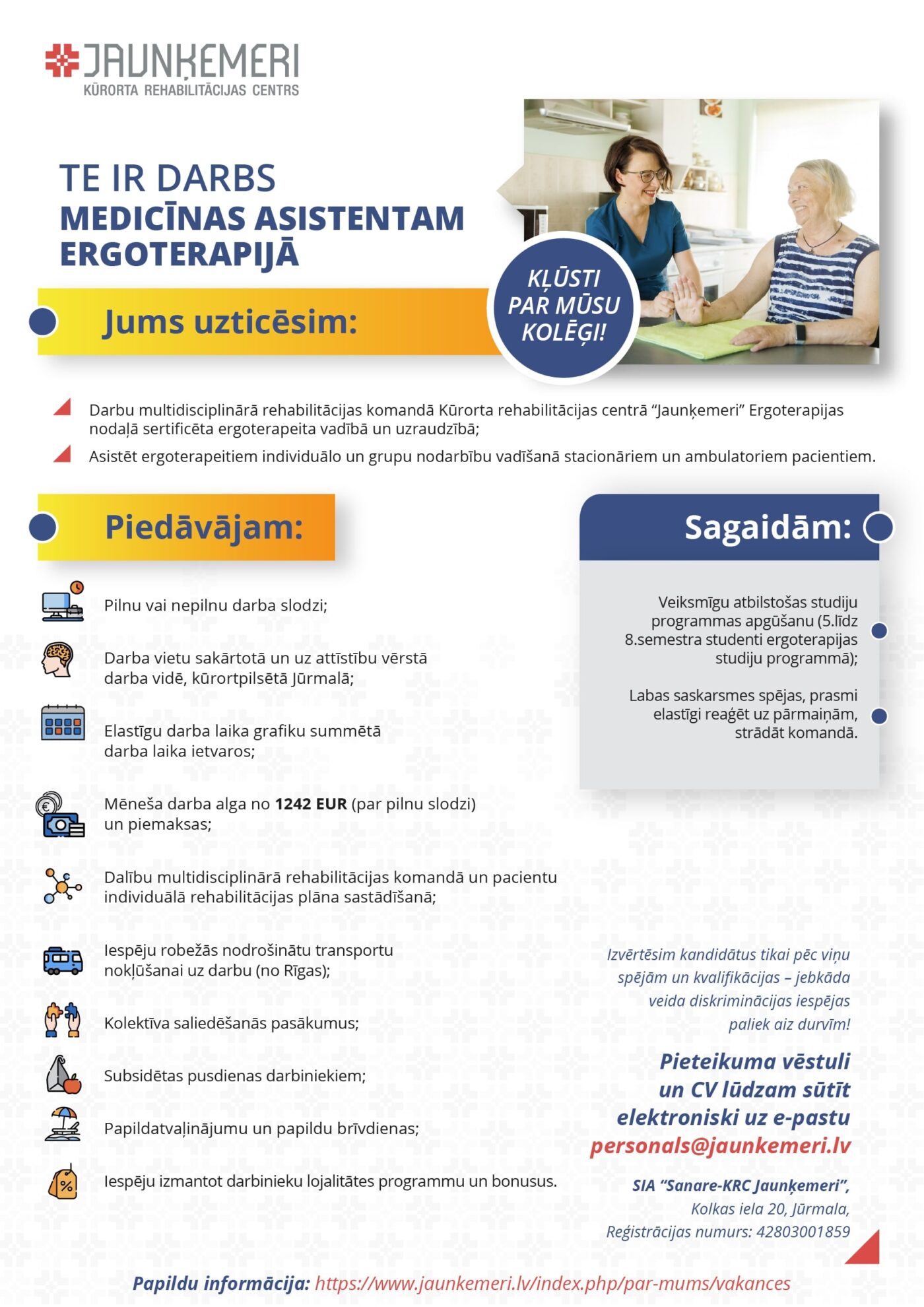 VAKANCE MEDICĪNAS ASISTENTAM ERGOTERAPIJĀ SIA „Sanare – KRC Jaunķemeri”